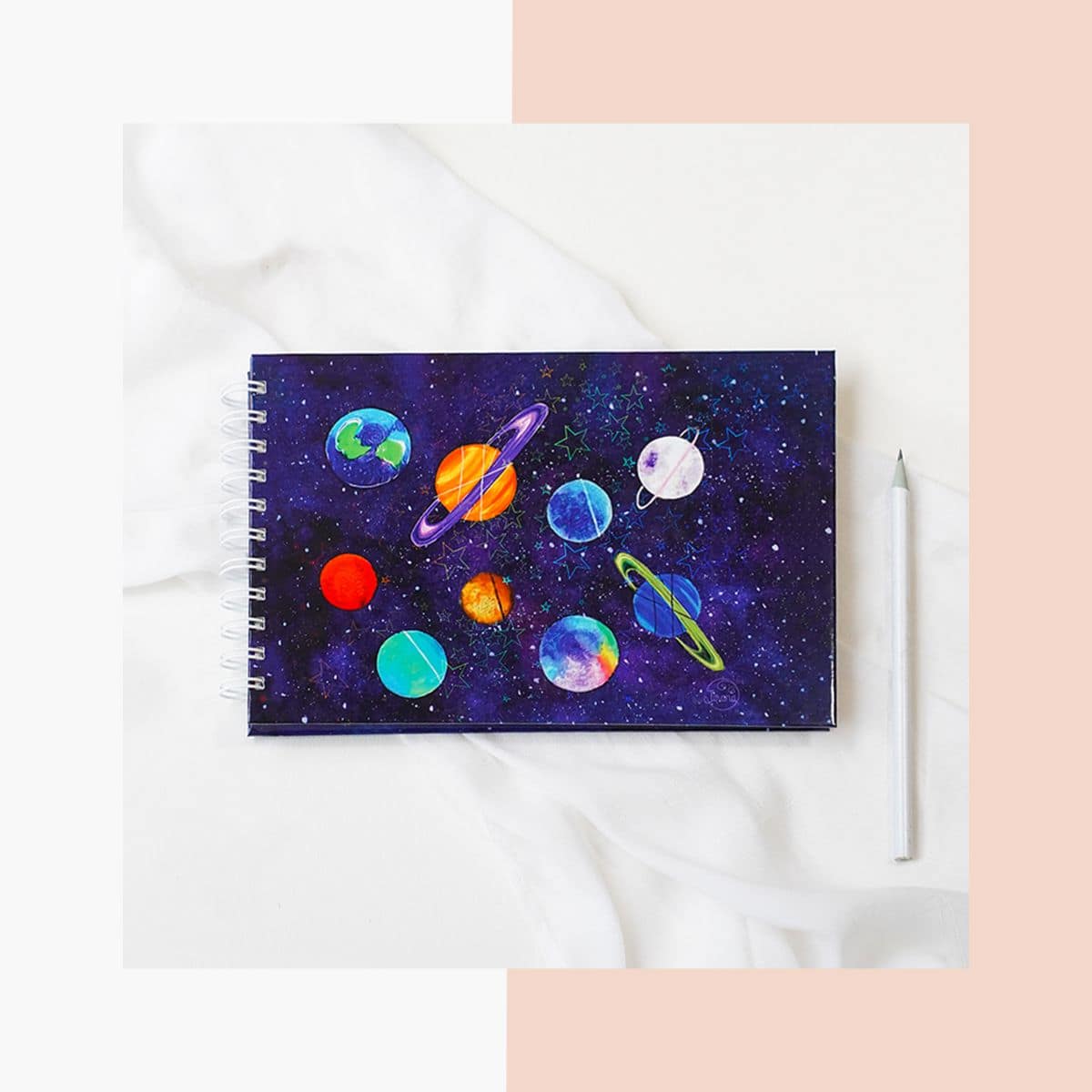 Our A5 Wiro Art Journal, a canvas for your creativity, adorned with Rhea Shah’s enchanting ‘DREAM’ artwork and a shimmering star sparkle lamination on the cover.