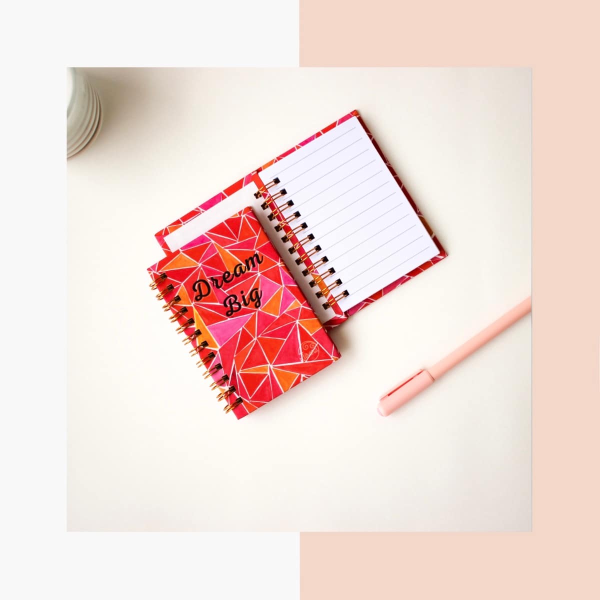 Our pocket A7 spiral Notebook is made with our artwork print illustrated by Rhea Shah as the cover, with a velvet lamination. The book contains 100 gsm thick paper consisting of 50 ruled pages.