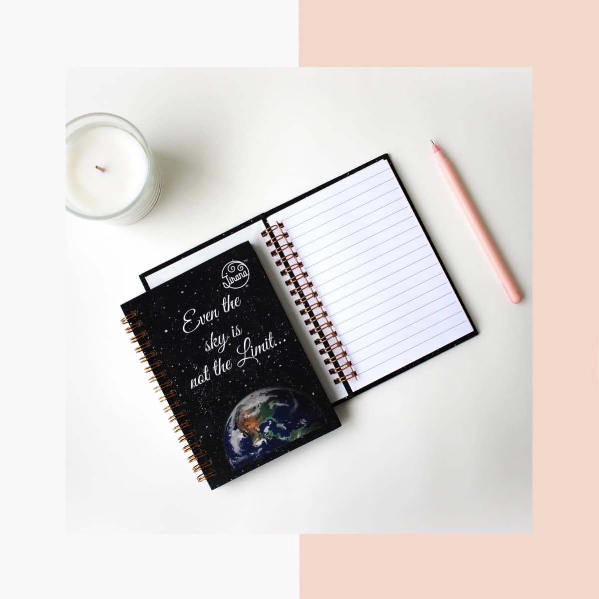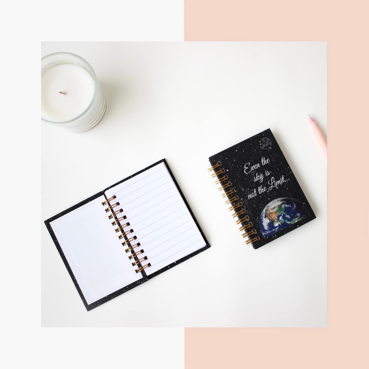 Our A6 mini spiral Notebook is made with our artwork print illustrated by Rhea Shah as the cover, with a velvet lamination. The book contains 100 gsm thick paper consisting of 50 ruled pages.