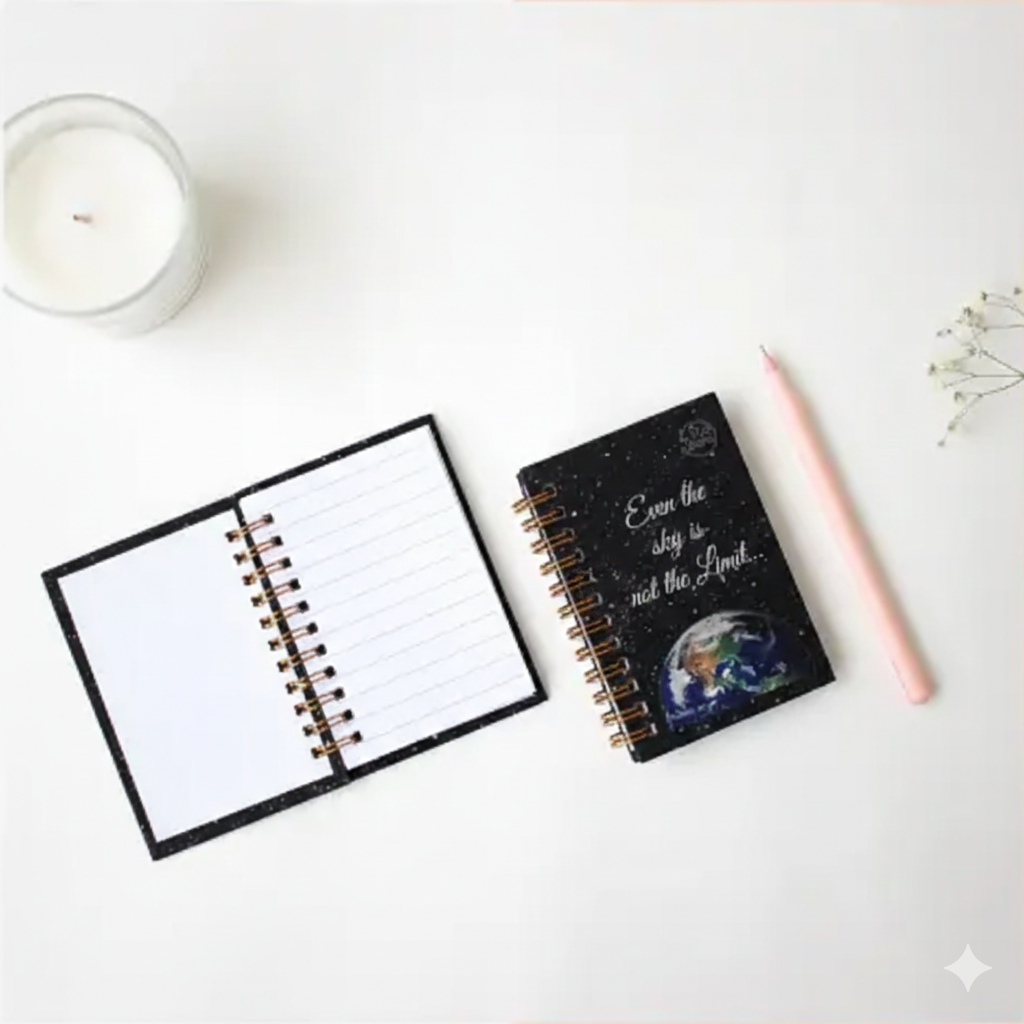 Our A7 pocket spiral Notebook is made with our artwork print illustrated by Rhea Shah as the cover, with a velvet lamination. The book contains 100 gsm thick paper consisting of 50 ruled pages. Over the moon Pocket A7 Spiral Notebook
